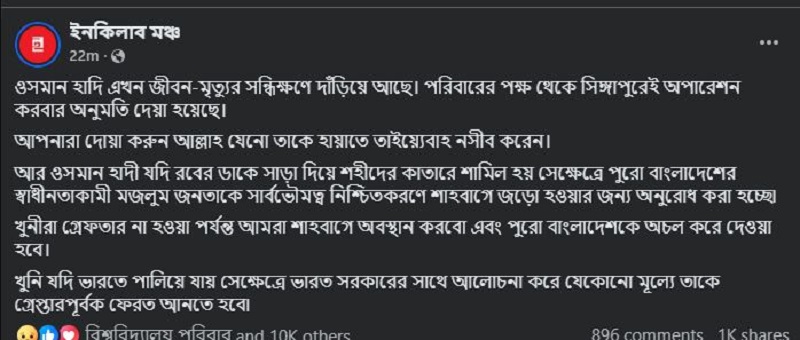 পোস্টে বলা হয়, ওসমান হাদি যদি রবের ডাকে সাড়া দিয়ে শহীদের কাতারে শামিল হয়, সেক্ষেত্রে পুরো বাংলাদেশের স্বাধীনতাকামী মজলুম জনতাকে সার্বভৌমত্ব নিশ্চিতকরণে শাহবাগে জড়ো হওয়ার জন্য অনুরোধ করা হচ্ছে৷ খুনিরা গ্রেপ্তার না হওয়া পর্যন্ত আমরা শাহবাগে অবস্থান করব এবং পুরো বাংলাদেশকে অচল করে দেওয়া হবে।