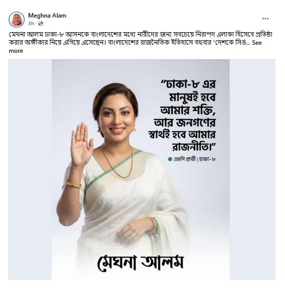 মেঘনা আলম বলেন, ঢাকা-৮ আসনকে বাংলাদেশের মধ্যে নারীদের জন্য সবচেয়ে নিরাপদ এলাকা হিসেবে প্রতিষ্ঠা করার অঙ্গীকার নিয়ে এগিয়ে এসেছেন। বাংলাদেশের রাজনৈতিক ইতিহাসে বহুবার “দেশকে সিঙ্গাপুর বানানো হবে”, এমন ফাঁপা প্রতিশ্রুতি শোনা গেছে। কিন্তু বাস্তবে একটি দেশকে আন্তর্জাতিক মানে উন্নীত করতে হলে প্রয়োজন এমন নেতৃত্ব, যার লালন-পালন, চিন্তাধারা, শিক্ষা ও সামাজিক মেলামেশায় বৈশ্বিক প্রভাব বিদ্যমান, এবং যিনি আন্তর্জাতিক পরিমণ্ডলে স্বাভাবিকভাবেই গ্রহণযোগ্য। মেঘনা আলম সেই বাস্তব উদাহরণ (the real deal), যিনি কেবল প্রতিশ্রুতি নয়, বাস্তবসম্মত রূপান্তরের প্রতিনিধিত্ব করেন।