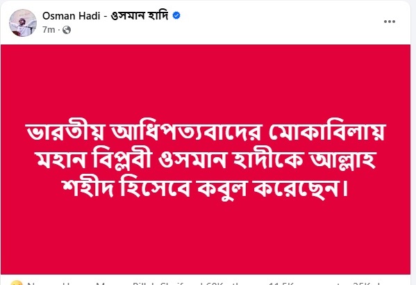 ওসমান হাদির ভেরিফায়েড ফেসবুক পেইজে লেখা হয়েছে, ভারতীয় আধিপত্যবাদের মোকাবিলায় মহান বিপ্লবী ওসমান হাদিকে আল্লাহ শহীদ হিসেবে কবুল করেছেন।
