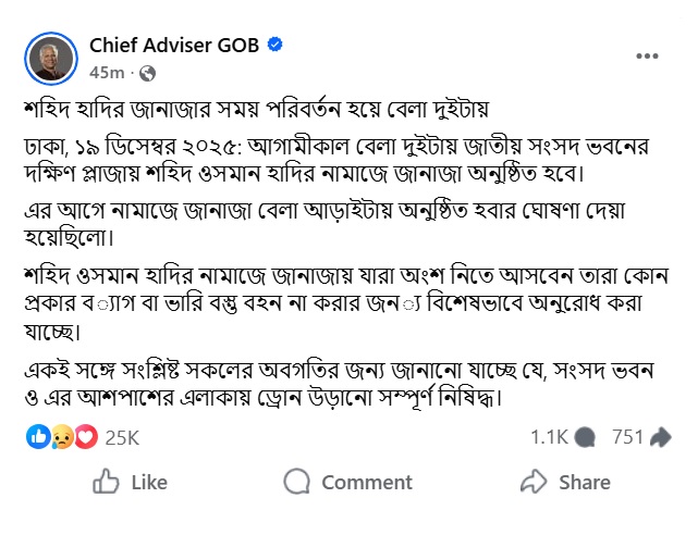ইনকিলাব মঞ্চের মুখপাত্র শহীদ শরিফ ওসমান হাদির জানাজা সময় পরিবর্তন করা হয়েছে। আজ শুক্রবার রাত সাড়ে সাতটার দিকে অন্তর্বর্তীকালীন সরকারের প্রধান উপদেষ্টার ফেইসবুক ভেরিফাইড পেজে বিষয়টি নিশ্চিত করা হয়েছে।