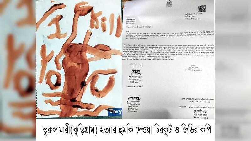 কুড়িগ্রামের ভূরুঙ্গামারীতে হত্যার হুমকি দিয়ে শাহ আলম নামে এক জামায়াত কর্মীর বাসার বেলকনিতে কে বা কারা একটি চিরকুট রেখে যায়৷ যেখানে একটি সাদা কাগজে রক্ত মাখা একটি পুতুলের ছবি একে তার মাঝে ইংরেজিতে লেখা ( I kill you)। চিরকুট পেয়ে আতঙ্কিত হয়ে পড়ে ওই পরিবার। এ ঘটনায় ওই জামায়াত কর্মী শুক্রবার রাতে ভূরুঙ্গামারী থানায় একটি সাধারণ ডায়েরি (জিডি) করেন। শনিবার ( ২০ ডিসেম্বর) সকালে ভূরুঙ্গামারী থানার অফিস ইনচার্জ (ওসি) আজিম উদ্দিন বিষয়টি নিশ্চিত করেছেন।