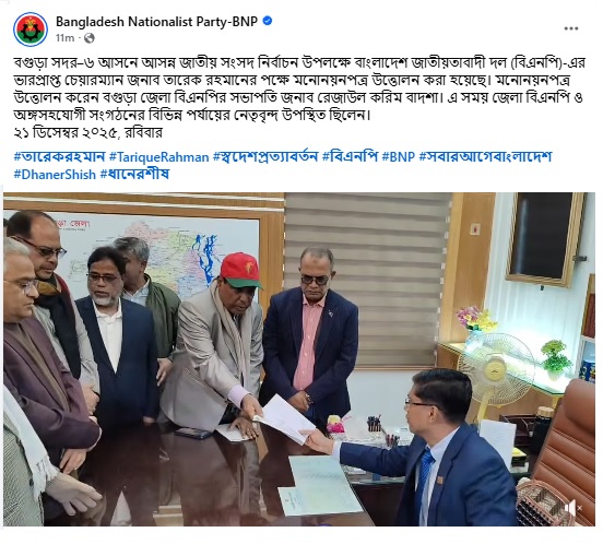 বিষয়টি বাংলাদেশ জাতীয়তাবাদী দল (বিএনপি) ফেইসবুক ভেরিফায়েড পেজে পোস্টের মাধ্যমে নিশ্চিত করেছে।