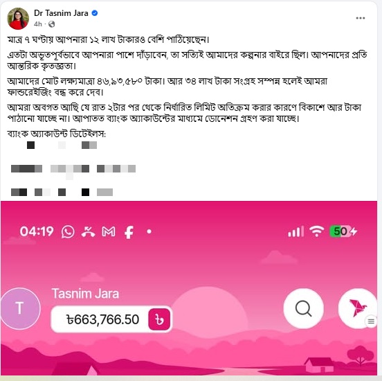 সামাজিক যোগাযোগমাধ্যম ফেসবুক স্ট্যাটাসে ডা. তাসনিম জারা লিখেছেন, মাত্র ৭ ঘণ্টায় আপনারা ১২ লাখ টাকারও বেশি পাঠিয়েছেন। এতটা অভূতপূর্বভাবে আপনারা পাশে দাঁড়াবেন, তা সত্যিই আমাদের কল্পনার বাইরে ছিল। আপনাদের প্রতি আন্তরিক কৃতজ্ঞতা। আমাদের মোট লক্ষ্যমাত্রা ৪৬,৯৩,৫৮০ টাকা। আর ৩৪ লাখ টাকা সংগ্রহ সম্পন্ন হলেই আমরা ফান্ডরেইজিং বন্ধ করে দেব। আমরা অবগত আছি যে রাত ২টার পর থেকে নির্ধারিত লিমিট অতিক্রম করার কারণে বিকাশে আর টাকা পাঠানো যাচ্ছে না। আপাতত ব্যাংক অ্যাকাউন্টের মাধ্যমে ডোনেশন গ্রহণ করা যাচ্ছে।