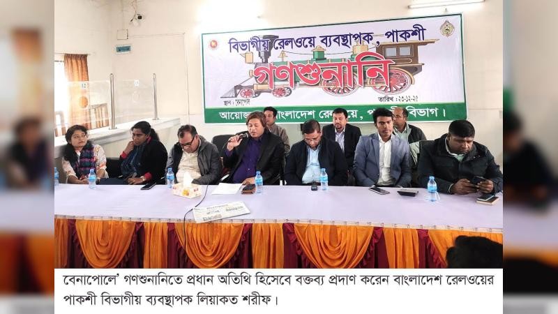 বেনাপোল রেলওয়ে স্টেশন মাস্টার আয়নাল হাসানের সভাপতিত্বে আয়োজিত গণশুনানিতে প্রধান অতিথি হিসেবে উপস্থিত ছিলেন পাকশী বিভাগীয় রেলওয়ে ব্যবস্থাপক লিয়াকত শরীফ।