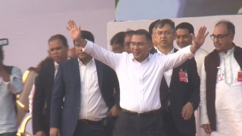 পরে বিমানবন্দর থেকে সর্বোচ্চ নিরাপত্তা ও প্রটোকলে বুলেটপ্রুফ বাসে করে তারেক রহমান পূর্বাচল ৩০০ ফিট এলাকার মঞ্চে পৌঁছান। সেখানে তারেক রহমানের সঙ্গে মঞ্চে দলীয় নেতাদের পাশাপাশি দীর্ঘ সময়ের স্বৈরাচার বিরোধী আন্দোলনের যুগপৎ সঙ্গী শরিক দলের শীর্ষ নেতারাও রয়েছেন। তবে, মঞ্চে শুধু মাত্র তারেক রহমানই বক্তব্য রাখবেন। মূলত এই মঞ্চে থেকেই প্রায় ১৮ বছর পর সশরীরে আগামী সংসদ নির্বাচনকে সামনে রেখে দেশবাসীর উদ্দেশ্যে বক্তব্য দেবেন তারেক রহমান।