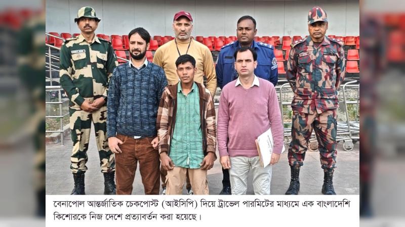 বেনাপোল আন্তর্জাতিক চেকপোস্ট (আইসিপি) দিয়ে ট্রাভেল পারমিটের মাধ্যমে এক বাংলাদেশি কিশোরকে নিজ দেশে প্রত্যাবর্তন করা হয়েছে। বৃহস্পতিবার (২৫ ডিসেম্বর) সন্ধ্যায় ভারতের পেট্রাপোল ইমিগ্রেশন পুলিশ তাকে বেনাপোল ইমিগ্রেশন পুলিশের কাছে হস্তান্তর করে।