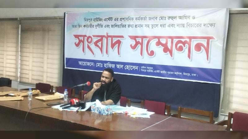গত রবিবার, ২৮ ডিসেম্বর, ২০২৫ তারিখে রাজস্থানী ঢাকার জাতীয় ক্লাবের তৃতীয় তলায় মাওলানা আকরাম খাঁ হলে আয়োজিত এক সংবাদ সম্মেলনে ভুক্তভোগী মো. হাফিজ আল হোসেন বলেন, তিনি মিরপুর হাউজিং এস্টেটের প্রশাসনিক কর্মকর্তার কার্যালয়ে অফিস সহায়ক হিসেবে কর্মরত। তিনি প্রশাসনিক কর্মকর্তা জনাব মো. রুহুল আমিন এবং দপ্তরের অপর তিন কর্মচারী মো. শহীদ উল্লাহ (অফিস সহকারী), মো. তাজুল ইসলাম (অফিস সহকারী) ও সুফিয়া বেগম (দৈনিক হাজিরা ভিত্তিক পিয়ন, অস্থায়ী)-এর দুর্নীতি, ঘুষ ও জালিয়াতির খবর জানতে পারেন। এর ফলে উল্টো তাঁরা দুর্নীতির দায় তাঁর উপর চাপিয়ে অফিসিয়ালভাবে তদবির করে তাঁকে ঢাকার বাইরে বদলি, সাময়িক বরখাস্ত এবং তাঁর বিরুদ্ধে বিভাগীয় মামলা (মামলা নং-০৩/২০২৫) দায়ের করেন।