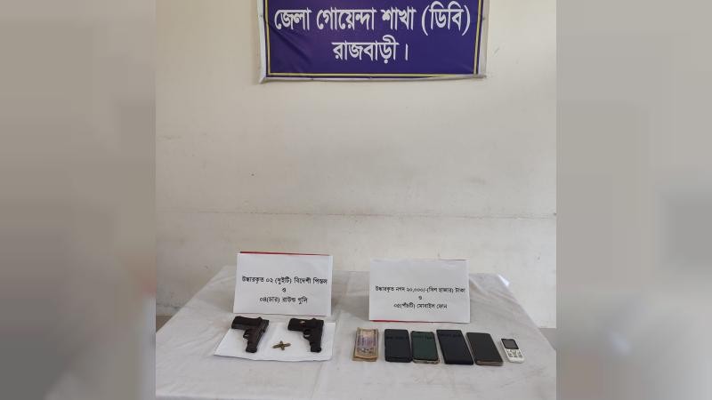 পুলিশ জানায়, গত রবিবার সন্ধ্যা সাড়ে ৭ টার দিকে রাজবাড়ী পৌর শহরের সেগুনবাগিচা এলাকায় সন্দেহভাজ কালো রংয়ের টয়োটা ব্রান্ডের প্রাইভেটকার থেকে চার যুবককে আটক করা হলে তাদের কাছ থেকে ২ টি আমেরিকা ৭.৬৫ এম এম দুইটি পিস্তল, চার রাউন্ড গুলি, পাচটি মোবাইল, নগদ ২০ হাজার টাকা উদ্ধার করা হয়।