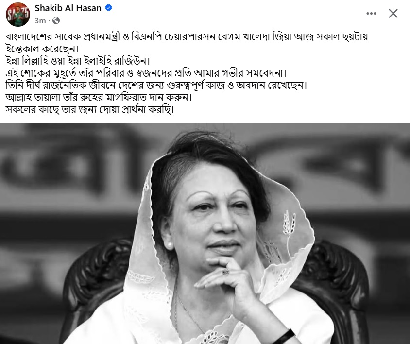 সাকিব সামাজিক যোগাযোগমাধ্যম ফেসবুকে লিখেছেন: “বাংলাদেশের সাবেক প্রধানমন্ত্রী ও বিএনপি চেয়ারপারসন বেগম খালেদা জিয়া আজ সকাল ছয়টায় ইন্তেকাল করেছেন। ইন্না লিল্লাহি ওয়া ইন্না ইলাইহি রাজিউন।