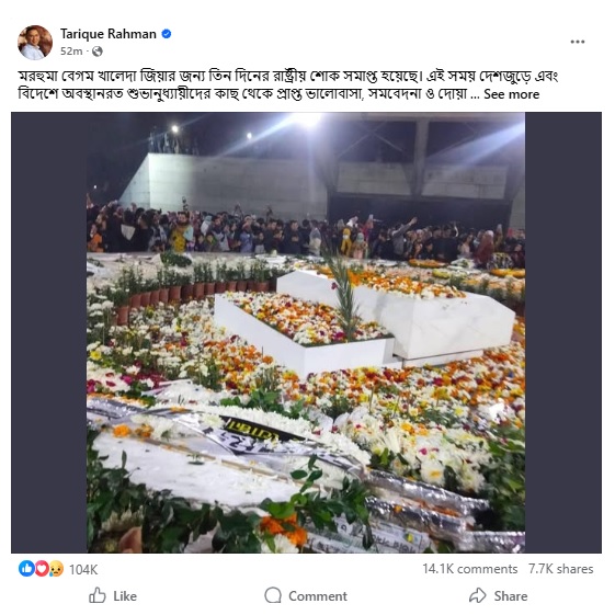 তাকে (খালেদা জিয়া) সমাধিতে পৌঁছে দিয়ে তারা জাতির শ্রদ্ধা ও ভালোবাসার প্রতিফলন ঘটিয়েছেন এবং তার অন্তিম যাত্রাকে প্রাপ্য সম্মানে আলোকিত করেছেন।