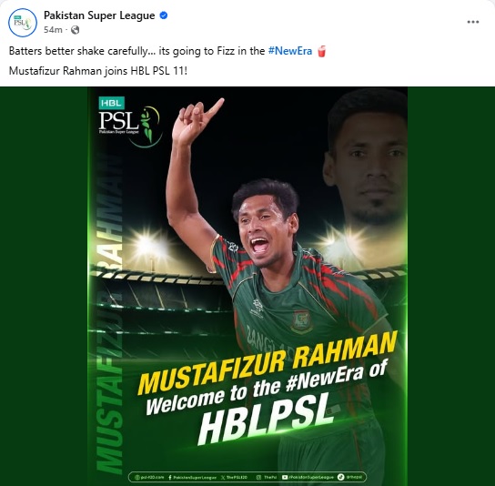 নিরাপত্তা শঙ্কায় আইপিএল থেকে বাদ পড়া মুস্তাফিজুর রহমান এবার পাকিস্তানের পিএসএলে খেলবেন। আগামী পিএসএলের ১১তম আসরে অংশ নিতে মুস্তাফিজকে স্বাগত জানিয়ে মঙ্গলবার (৬ জানুয়ারি) পাকিস্তান সুপার লিগের (পিএসএল) অফিসিয়াল ফেসবুক পেজ থেকে একটি পোস্ট প্রকাশ করা হয়েছে। সেখানে লেখা হয়েছে, ব্যাটাররা সাবধান… এবার নতুন অধ্যায় শুরু করতে যাচ্ছেন ফিজ। পিএসএলের ১১তম আসরে যোগ দিচ্ছেন মুস্তাফিজ।