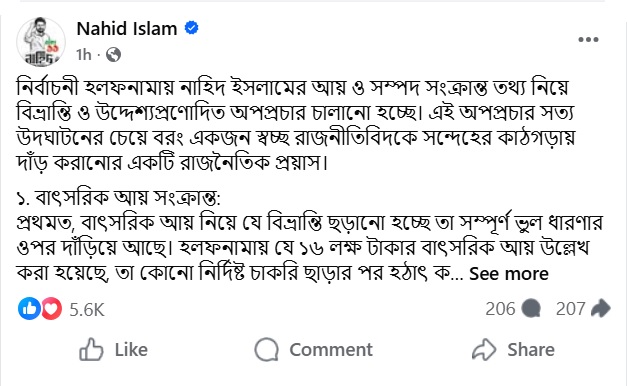 ফেসবুকের ওই এডমিন পোস্টে বলা হয়েছে, নির্বাচনি হলফনামায় নাহিদ ইসলামের আয় ও সম্পদ সংক্রান্ত তথ্য নিয়ে বিভ্রান্তি ও উদ্দেশ্যপ্রণোদিত অপপ্রচার চালানো হচ্ছে। এই অপপ্রচার সত্য উদঘাটনের চেয়ে বরং একজন স্বচ্ছ রাজনীতিবিদকে সন্দেহের কাঠগড়ায় দাঁড় করানোর একটি রাজনৈতিক প্রয়াস।