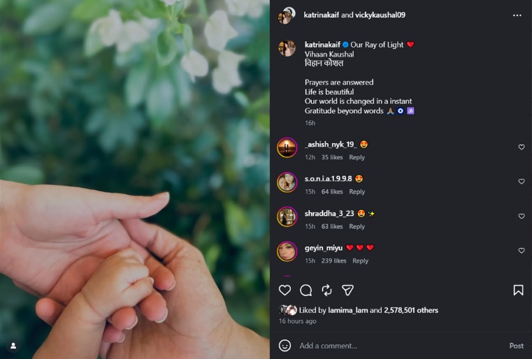ক্যাটরিনা এবং ভিকি সন্তানের হাতের ছবি পোস্ট করে ক্যাপশনে লিখেছেন, ‘আমাদের আলোর রশ্মি বিহান কৌশল। আমাদের প্রার্থনার ফল। জীবন সত্যিই সুন্দর। এক মুহূর্তে আমাদের জীবন বদলে গেছে। আমি কতটা কৃতজ্ঞ, সেটা ভাষায় প্রকাশ করা সম্ভব নয়।’