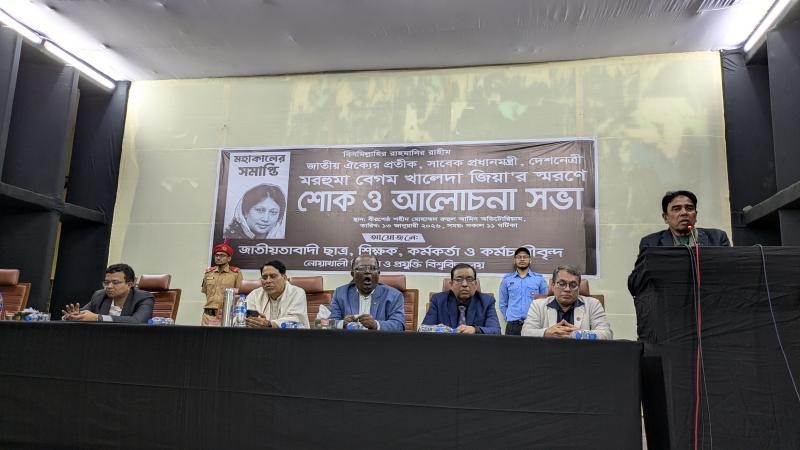 নোয়াখালী বিজ্ঞান ও প্রযুক্তি বিশ্ববিদ্যালয়ে (নোবিপ্রবি) জীববিজ্ঞান অনুষদের ডিন অধ্যাপক ড. মুহাম্মদ শফিকুল ইসলামের সভাপতিত্বে শোকসভায় উপস্থিত ছিলেন নোয়াখালী-৫ আসনের বিএনপির মনোনীত সংসদ সদস্য মোহাম্মদ ফখরুল ইসলাম,নোয়াখালী জেলা বিএনপির আহ্বায়ক মাহবুর আলমগীর আলো, সদস্য সচিব হারুনুর রশীদ আজাদ, নোয়াখালী বিজ্ঞান ও প্রযুক্তি বিশ্ববিদ্যালয়ে উপ-উপাচার্য অধ্যাপক ড. মোহাম্মদ রেজওয়ানুল হক, ট্রেজারার অধ্যাপক ড. মোহাম্মদ হানিফ মুরাদ,নোবিপ্রবি প্রকৌশল ও প্রযুক্তি অনুষদের ডিন অধ্যাপক ড. আসাদুন নবী, শিক্ষা বিজ্ঞান অনুষদের ডিন অধ্যপক ড. মো. জাহাঙ্গীর সরকার, বিজ্ঞান অনুষদের ডিন অধ্যাপক ড. মোহাম্মদ মহিনুজ্জামান, সামাজিক বিজ্ঞান ও মানবিক অনুষদের ডিন অধ্যাপক ড. মো. রোকনুজ্জামান সিদ্দিকী, বিবি খাদিজা হলের প্রভোস্ট ড. মো. আবদুল কাইয়ুম মাসুদ, নোবিপ্রবি প্রক্টর এ এফ এম আরিফুর রহমান, রেজিস্ট্রার (ভারপ্রাপ্ত) মোহাম্মদ তামজিদ হোছাইন চৌধুরী, রসায়ন বিভাগের চেয়ারম্যান অধ্যাপক মোহাম্মদ সাইফুল ইসলাম, পদার্থবিজ্ঞান বিভাগের চেয়ারম্যান অধ্যাপক মোহাম্মদ জাবেদ হোসেন, সংস্থাপন শাখার উপ-রেজিস্ট্রার মোহাম্মদ ইসমাইল হোসেন ও শাখা কর্মকর্তা মো. জিয়াউর রহমানসহ শিক্ষকরা।
