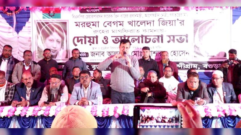 বগুড়ার নন্দীগ্রামে বিএনপির চেয়ারপারসন ও সাবেক প্রধানমন্ত্রী মরহুমা বেগম খালেদা জিয়ার রুহের মাগফেরাত কামনায় দোয়া ও আলোচনা সভা অনুষ্ঠিত হয়েছে। বৃহস্পতিবার (১৫ জানুয়ারি) বিকালে বুড়ইল ইউনিয়ন বিএনপির আয়োজনে বুড়ইল উচ্চ বিদ্যালয় মাঠে এ দোয়া ও আলোচনা সভা অনুষ্ঠিত হয়।