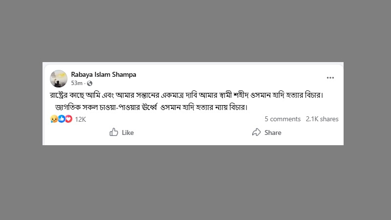 ওই পোস্টে তিনি লিখেছেন, ‘রাষ্ট্রের কাছে আমি এবং আমার সন্তানের একমাত্র দাবি—আমার স্বামী শহীদ ওসমান হাদি হত্যার বিচার।’