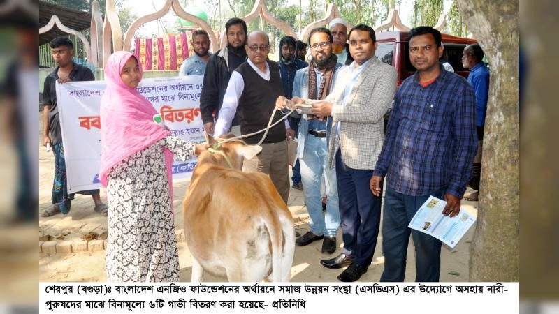 বগুড়ার শেরপুরে বাংলাদেশ এনজিও ফাউন্ডেশনের অর্থায়নে সমাজ উন্নয়ন সংস্থা (এসডিএস) এর উদ্যোগে উপজেলার শাহ্বন্দেগী ইউনিয়নের ঘোলাগাড়ী কলোনী ও বাঘমারা গ্রামের গরিব ও অসহায় নারী-পুরুষদের মাঝে বিনামূল্যে ৬টি গাভী বিতরণ করা হয়েছে।