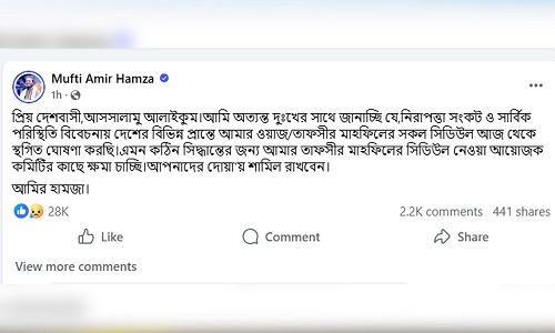 আমির হামজা বলেন, ‘প্রিয় দেশবাসী, আসসালামু আলাইকুম। আমি অত্যন্ত দুঃখের সঙ্গে জানাচ্ছি যে, নিরাপত্তা সংকট ও সার্বিক পরিস্থিতি বিবেচনায় দেশের বিভিন্ন প্রান্তে আমার ওয়াজ/তাফসির মাহফিলের সব শিডিউল আজ থেকে স্থগিত ঘোষণা করছি।