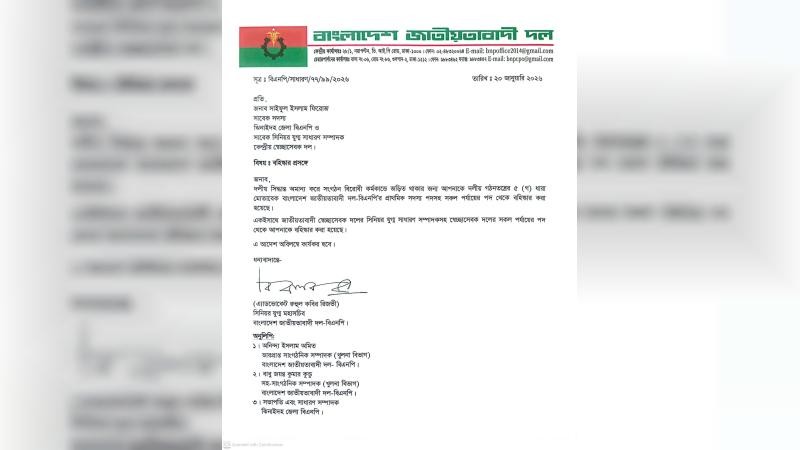 বহিষ্কার সংক্রান্ত আদেশের অনুলিপি খুলনা বিভাগের ভারপ্রাপ্ত সাংগঠনিক সম্পাদক অনিন্দ্য ইসলাম অমিত, সহ-সাংগঠনিক সম্পাদক বাবু জয়ন্ত কুমার কুন্ডু এবং ঝিনাইদহ জেলা বিএনপির সভাপতি ও সাধারণ সম্পাদক বরাবর প্রেরণ করা হয়েছে। দলীয় শৃঙ্খলা বজায় রাখতে বিএনপি ভবিষ্যতেও সংগঠনবিরোধী কর্মকাণ্ডের বিরুদ্ধে কঠোর অবস্থান গ্রহণ করবে বলে দলীয় সূত্রে জানা গেছে।