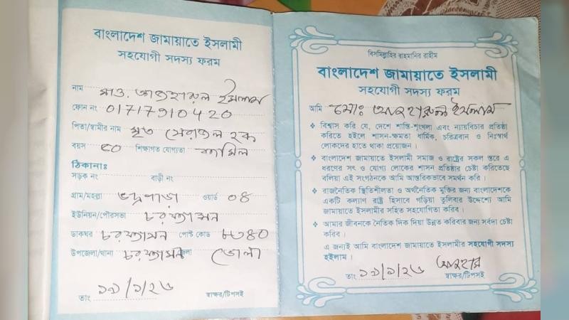 মঙ্গলবার (২০ জানুয়ারী) চরফ্যাশন পৌর জামায়াতের কর্ম পরিষদ সদস্য জয়নাল আবেদীন ভূইয়া বিষয়টি নিশ্চিত করেছেন। এর আগে সোমবার জামায়াতে ইসলামী'র দলীয় ফরম পূরণ করে তিনি দলটিতে যোগদান করেন।