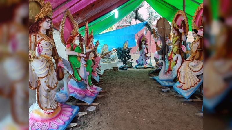 সরেজমিনে দেখা গেছে, প্রতিমা কারিগররা শেষ মুহূর্তের সাজ-সজ্জার কাজে নিযুক্ত। ৩১ বছর ধরে জগন্নাথ হলের সরস্বতী প্রতিমা নির্মাণে অংশ নেয়া শ্রীপতি পাল বলেন, আমরা গোপালগঞ্জ থেকে সাতজনের একটি দল। সব কাজ শেষ পর্যায়ে আছে, রাতের মধ্যে প্রতিমা পুরোপুরি প্রস্তুত করা হবে।
