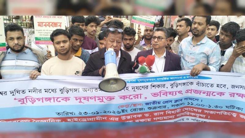 আমাদের প্রিয় বুড়িগঙ্গা নদী আজ ভয়াবহ দূষণের শিকার। অপরিকল্পিত শিল্পবর্জ্য, গৃহস্থালি আবর্জনা ও অব্যবস্থাপনার কারণে নদীটি তার স্বাভাবিক প্রাণশক্তি হারাচ্ছে, যা পরিবেশগত অবিচার (Environmental Injustice) সৃষ্টি করার পাশাপাশি সাধারণ মানুষের জীবন ও জীবিকায় মারাত্মক বৈষম্য ডেকে আনছে।এ প্রেক্ষাপটে বুড়িগঙ্গা নদী রক্ষা, পরিবেশগত ন্যায্যতা প্রতিষ্ঠা এবং বৈষম্য দূরীকরণে জনসচেতনতা বৃদ্ধির লক্ষ্যে ও দূষণ মুক্ত করার আজ ২৩-০১-২০২৬ ইং সকাল ১১ ঘটিকায় প্রেসক্লাবে একটি শান্তিপূর্ণ ও শৃঙ্খলাপূর্ণ মানব বন্ধন কর্মসূচি আয়োজন করে পানি ও পরিবেশ বিজ্ঞানী ড. রাস বিহারী ঘোষের নেতৃত্বে অনেক সাংবাদিক, আইনজীবী এবং সমাজকর্মীরা।