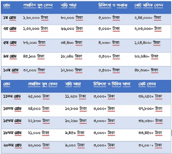 অবশেষে সরকারি চাকরিজীবীদের বহুল প্রত্যাশিত নতুন পে স্কেল ঘোষণা করা হয়েছে। জাতীয় বেতন কমিশনের সুপারিশ অনুযায়ী, এতে সরকারি চাকরিজীবীদের বেতন ১০০ থেকে ১৪২ শতাংশ পর্যন্ত বাড়ানোর প্রস্তাব করা হয়েছে। প্রস্তাবিত কাঠামো অনুযায়ী, ২০তম গ্রেডভুক্ত কর্মচারীদের মূল বেতন ২০ হাজার টাকা এবং প্রথম গ্রেডের কর্মকর্তাদের বেতন ১ লাখ ৬০ হাজার টাকা নির্ধারণের সুপারিশ করা হয়েছে।