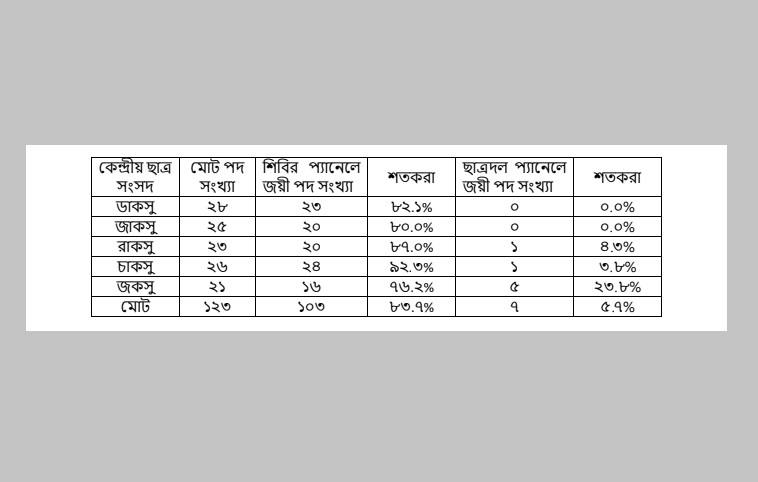 শিবির সমর্থিত প্যানেলগুলো মোট ৮৩.৭% পদে বিজিত হয়েছে যেটা অস্বাভাবিকভাবে বেশি। যেখানে লক্ষ লক্ষ শিক্ষার্থীদের ভোটের এত বড় নমুনা ও বিএনপির মত বড় রাজনৈতিক দলের প্রতিনিধিরা প্রতিদ্বন্দ্বিতা করেছেন সেখানে এমন একপাক্ষিক জয় বিস্মিত করার মত। জয়-পরাজয় থাকবে, কিন্তু বিজিত ও নিকটতম প্রতিদ্বন্দ্বীর মধ্যে প্রাপ্ত আসন সংখ্যার পার্থক্য যখন অসাধারণভাবে পরিলক্ষিত হয়, তখন সেখানে কিছু পুশ-পুল ফ্যাক্টর বা অদৃশ্য খেলা থাকার সম্ভাবনা থাকে।