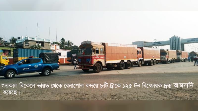 বেনাপোল স্থলবন্দরের ভারপ্রাপ্ত পরিচালক (ট্রাফিক) শামিম হোসেন জানান, দিনাজপুরের মধ্যপাড়া গ্রানাইট মাইনিং কোম্পানি লিমিটেডের খনন কাজ পরিচালনার জন্য ভারত থেকে ১২৭ মেট্রিক টন ওজনের বিস্ফোরক দ্রব্য আমদানি হয়েছে। বিস্ফোরক দ্রব্যের ভারতীয় ট্রাক বেনাপোল বন্দরের ৩১ নম্বর ট্রান্সশিপমেন্ট ইয়ার্ডে প্রশাসনিক নিরাপত্তায় রাখা হয়েছে। খালাসের জন্য প্রয়োজনীয় কাগজপত্র বন্দর ও কাস্টমসে দাখিল করবে আমদানি কারকের প্রতিনিধি সিঅ্যান্ডফ এজেন্ট। কাগজপত্রের আনুষ্ঠানিকতা শেষ হলে এসব বিস্ফোরক দ্রব্য খালাস করে বাংলাদেশি ট্রাকে করে দিনাজপুরে নেওয়া হবে। অপ্রীতিকর ঘটনা এড়াতে বন্দর এলাকায় নিরাপত্তা জোরদার করা হয়েছে।