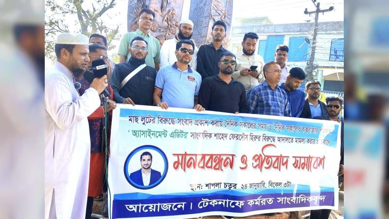 কক্সবাজারের উখিয়ায় বিএনপি নেতার মাছ লুটের অভিযোগ নিয়ে সংবাদ প্রকাশের জেরে এক সাংবাদিকের বিরুদ্ধে মামলা দায়েরের ঘটনাকে কেন্দ্র করে টেকনাফে মানববন্ধন ও প্রতিবাদ সমাবেশ করেছেন স্থানীয় সাংবাদিকেরা।
