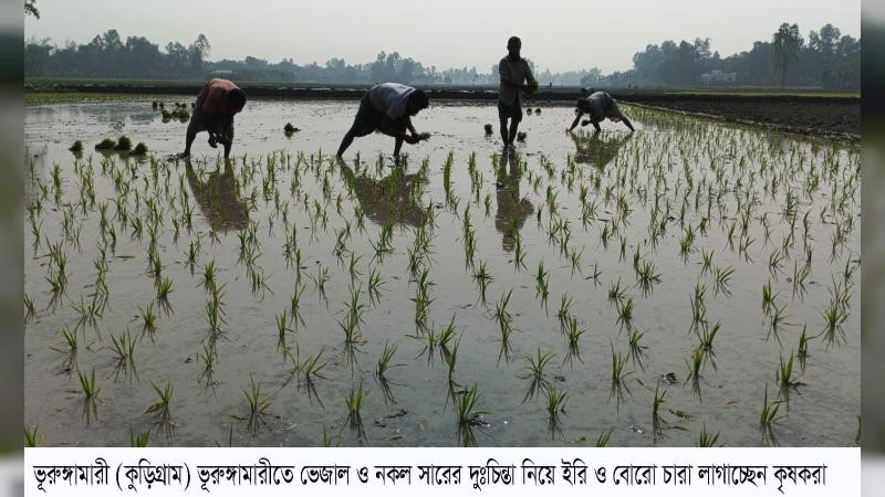 নকল ও ভেজাল সারের দুশ্চিন্তা মাথায় নিয়েই চলতি ইরি-বোরো মৌসুমে ধান চাষ শুরু করেছেন কুড়িগ্রামের ভূরুঙ্গামারী উপজেলার প্রান্তিক ও চরাঞ্চলের কৃষকরা। আসল-নকল না বুঝেই সার কিনে প্রতারিত হচ্ছেন অধিকাংশ কৃষক। জমিতে ব্যবহারের পর কৃষকরা বুঝতে পারছেন এসব সার নকল ও নিম্নমানের। ভেজাল সার ব্যবহার করে প্রত্যাশা মতো ফলন না পাওয়ার অভিযোগ করছেন তারা।