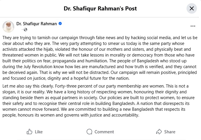 জামায়াত আমির এক এক্স পোস্টে জানান, হ্যাক হওয়া অ্যাকাউন্ট থেকে তার বিরুদ্ধে সেসব তথ্য প্রকাশিত হয়েছে তা পুরোপুরি ভুয়া ও মনগড়া।