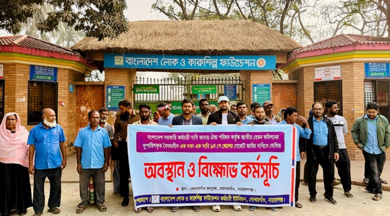 জাতীয় বেতন কমিশনের সুপারিশ বাস্তবায়ন ও ৯ম পে-স্কেলের গেজেট জারির দাবিতে নারায়ণগঞ্জের সোনারগাঁয়ে বাংলাদেশ লোক ও কারুশিল্প ফাউন্ডেশনের সোনারগাঁ জাদুঘরের কর্মচারীরা অবস্থান ও বিক্ষোভ কর্মসূচি পালন করেছেন।