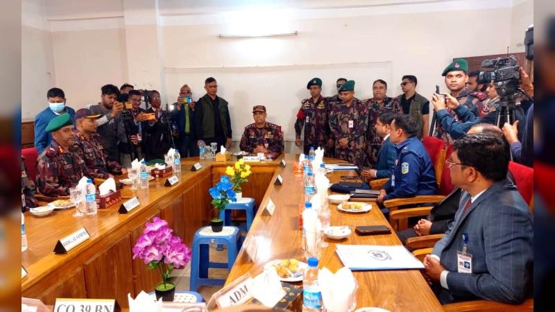 মতবিনিময়কালে বিজিবির অতিরিক্ত মহাপরিচালক (অপারেশন ও প্রশিক্ষণ) ব্রিগেডিয়ার জেনারেল সোহরাব হোসেন, বিজিবির সরাইল রিজিয়ন কমান্ডার ব্রিগেডিয়ার জেনারেল সাইফুল ইসলাম চৌধুরী, বিজিবির ময়মনসিংহ সেক্টর কমান্ডার কর্নেল সরকার মোস্তাফিজুর রহমান, ময়মনসিংহ ব্যাটালিয়ন ৩৯ বিজিবির অধিনায়ক লেফটেন্যান্ট কর্নেল মোহাম্মদ নুরুল আমীন বায়েজীদ, সেনাবাহিনীর ৫৮ বেঙ্গলের অধিনায়ক লেফটেন্যান্ট কর্নেল মো. আল আমীন, শেরপুরের জেলা প্রশাসক তরফদার মাহমুদুর রহমান, পুলিশ সুপার মো. কামরুল ইসলামসহ ডি জিএফ আই, এন এস আই, জেলার ৫ উপজেলা নির্বাহী কর্মকর্তাগণসহ অন্যান্য আইন প্রয়োগকারী সংস্থার প্রতিনিধিগণ উপস্থিত ছিলেন। মতবিনিময় শেষে তিনি নির্বাচনী বেইজ ক্যাম্পে দায়িত্বরত বিজিবি সদস্যদের সাথে কুশল বিনিময় করেন। এর আগে দুপুরে হেলিকপ্টারযোগে ঝিনাইগাতী উপজেলা মিনি স্টেডিয়ামে অবতরণ করেন বিজিবি মহাপরিচালক।