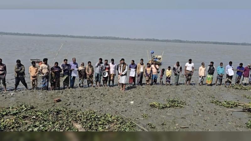 মানববন্ধনে স্থানীয় ভুক্তভোগী জেলে, তাদের পরিবার-পরিজন ও এলাকার গণ্যমান্য ব্যক্তিবর্গ উপস্থিত ছিলেন।