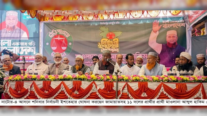 ত্রয়োদশ জাতীয় সংসদ নির্বাচন উপলক্ষ্যে নাটোর-৪ (গুরুদাসপুর-বড়াইগ্রাম) আসনে জামায়াতে ইসলামীর মনোনীত দাঁড়িপাল্লা প্রতীকের এমপি প্রার্থী অধ্যাপক মাওলানা আব্দুল হাকিম নির্বাচনী ইশতেহার ঘোষণা করেছেন। শনিবার দুপুরে বনপাড়া পৌর নির্বাচনী কার্যালয়ে এ ইশতেহার প্রকাশ করেন তিনি।