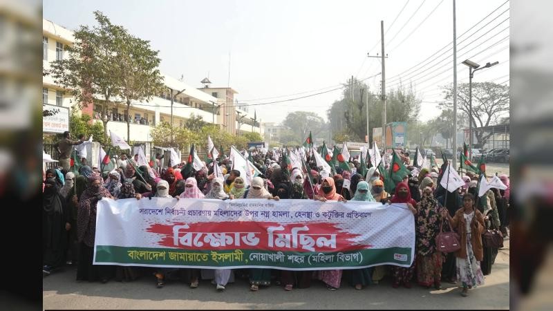 নির্বাচনকালীন সময়ে নারী হেনস্তার সাথে জড়িতদের বিরুদ্ধে তাৎক্ষণিক ব্যবস্থা ও দৃষ্টান্তমূলক শাস্তি নিশ্চিত করা, ভোট কেন্দ্র ও এর আশেপাশে নারী ভোটারদের নিরাপত্তায় অতিরিক্ত আইনশৃঙ্খলা বাহিনী মোতায়েন, নারী ভোটার ও নারীকর্মীদের হয়রানির প্রতিবাদে ভ্রাম্যমান আদালত কার্যক্রম জোরদার করা সহ পাঁচ দফা দাবিতে নোয়াখালীতে বিক্ষোভ মিছিল করেছে বাংলাদেশ জামায়াতে ইসলামীর মহিলা বিভাগ।