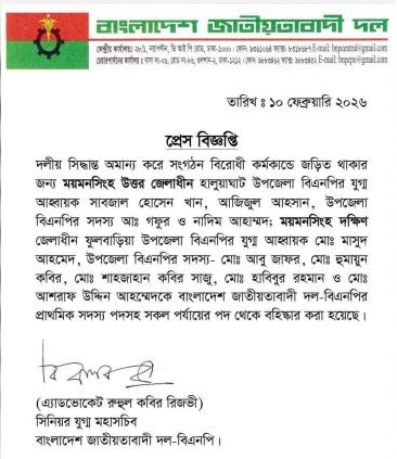 বহিস্কৃতরা হলেন ময়মনসিংহ উত্তর জেলাধীন হালুয়াঘাট উপজেলা বিএনপির যুগ্ম আহ্বায়ক সাবজাল হোসেন খান, আজিজুল আহসান, উপজেলা বিএনপির সদস্য আঃ গফুর ও নাদিম আহাম্মদ।
