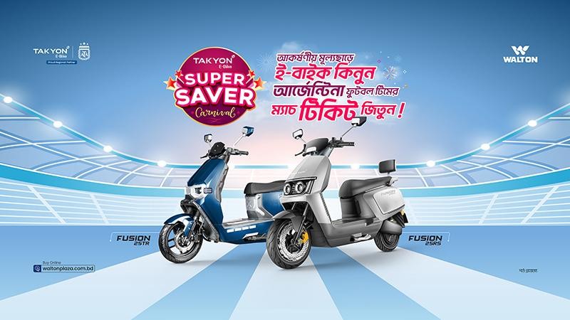 ওয়ালটন ডিজি-টেক ইন্ডাস্ট্রিজ লিমিটেড তাদের জনপ্রিয় ইলেকট্রিক বাইক ব্র্যান্ড তাকিওন (TAKYON) ই-বাইক সিরিজে ঘোষণা করেছে বিশেষ ‘সুপার সেভার কার্নিভাল অফার’। ১ ফেব্রুয়ারি থেকে ৩০ এপ্রিল ২০২৬ পর্যন্ত চলমান এই অফারের আওতায় গ্রাহকদের জন্য রয়েছে নতুন আসা মডেলে ৯,৬০০ টাকা পর্যন্ত আকর্ষণীয় মূল্যছাড়ের পাশাপাশি ব্যতিক্রমী পুরস্কার পাওয়ার সুযোগ।