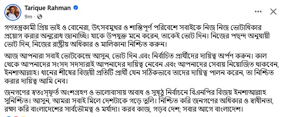 পোস্টে তারেক রহমান বলেন, ভোটাররা যেন কেন্দ্রগুলোতে গিয়ে ভোট দেন এবং নির্বাচিত প্রার্থীদের ওপর দায়িত্ব অর্পণ করেন। তিনি আশা প্রকাশ করেন, নির্বাচিত সংসদ সদস্যরা জনগণের সেবায় নিয়োজিত থাকবেন।