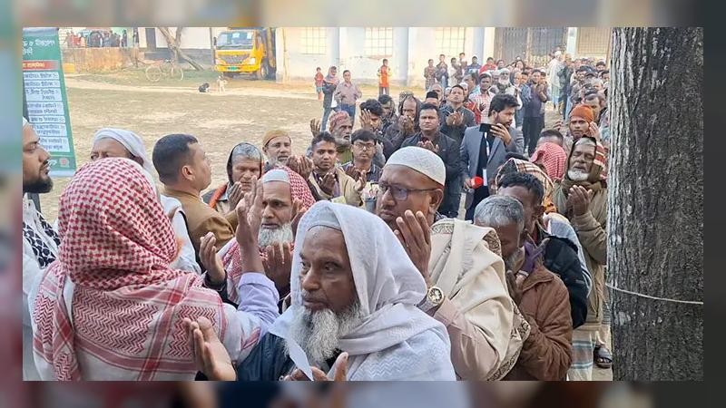 ভোটগ্রহণ শুরুর আগে মহান আল্লাহর কাছে শুকরিয়া আদায় করে মোনাজাতের মাধ্যমে ভোট প্রদান শুরু করেছেন কিশোরগঞ্জের ভোটাররা। বৃহস্পতিবার (১২ ফেব্রুয়ারি) সকাল সাড়ে ৭টায় ভোট শুরুর আগে জেলার পাকুন্দিয়া উপজেলার সৈয়দগাঁও সরকারি প্রাথমিক বিদ্যালয় কেন্দ্রে এমন দৃশ্য দেখা যায়।