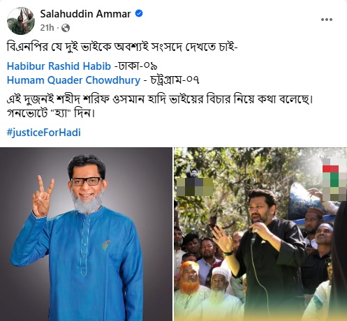 গতকাল বুধবার (১১ ফেব্রুয়ারি) বিকেলে নিজের ফেসবুক পোস্টে আম্মার বলেন, বিএনপির দুজনকে তিনি সংসদে দেখতে চান। একজন হলেন, হুম্মাম কাদের চৌধুরী।