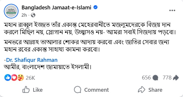 জামায়াত আমির তার পোস্টে লেখেন, ‘মহান রাব্বুল ইজ্জত তার একান্ত মেহেরবানিতে মজলুমদেরকে বিজয় দান করলে মিছিল নয়, স্লোগান নয়, উচ্ছ্বাসও নয়- আমরা সবাই সিজদায় পড়বো।’