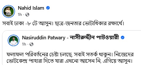 নাসীরুদ্দীন পাটোয়ারী এক ফেসবুক পোস্টে এই অভিযোগ করার পর তা শেয়ার দিয়ে এনসিপির আহ্বায়ক নাহিদ ইসলাম লিখেছেন, ‘সবাই ঢাকা-৮ এ আসুন। ছাত্র-জনতার ভোটাধিকার রক্ষার্থে।’