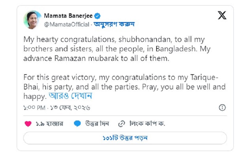 পোস্টে মমতা বলেন, বাংলাদেশের সকল ভাইবোনকে, জনগণকে, জানাই আমার শুভনন্দন, আমার আগাম রমজান মোবারক। বাংলাদেশের এই বিপুল জয়ের জন্য অভিনন্দন জানাই আমার তারেক ভাইকে, তার দলকে ও অন্যান্য দলকে। সবাই ভালো থাকুন, সুখী থাকুন।