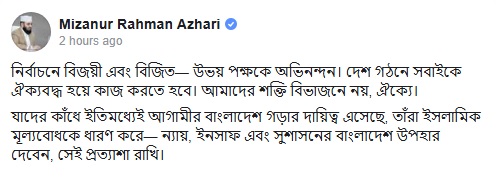 পোস্টে মিজানুর রহমান আজহারী লেখেছেন, নির্বাচনে বিজয়ী এবং বিজিত— উভয় পক্ষকে অভিনন্দন। দেশ গঠনে সবাইকে ঐক্যবদ্ধ হয়ে কাজ করতে হবে। আমাদের শক্তি বিভাজনে নয়, ঐক্যে।