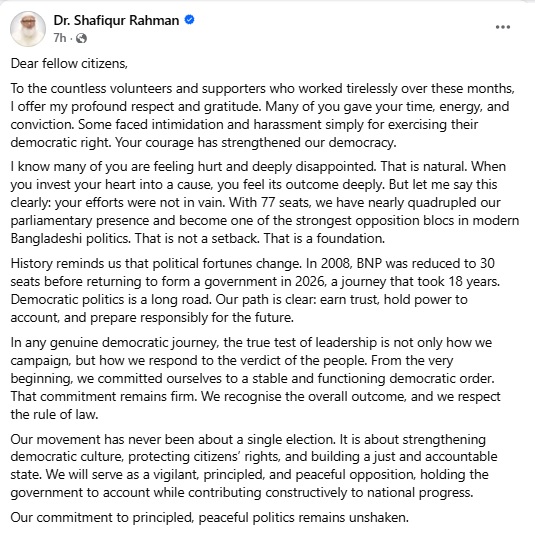 শফিকুর রহমান আরও লিখেন, যেকোনো প্রকৃত গণতান্ত্রিক অভিযাত্রায় নেতৃত্বের আসল পরীক্ষা শুধু নির্বাচনী প্রচারণায় নয়, বরং জনগণের রায়কে কীভাবে গ্রহণ করি তার ওপর নির্ভর করে। শুরু থেকেই আমরা একটি স্থিতিশীল ও কার্যকর গণতান্ত্রিক ব্যবস্থার প্রতি প্রতিশ্রুতিবদ্ধ ছিলাম, সেই প্রতিশ্রুতিতে এখনো অটল। আমরা সামগ্রিক ফলাফলকে স্বীকৃতি দিচ্ছি এবং আইনের শাসনের প্রতি শ্রদ্ধা জানাচ্ছি।