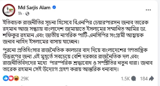 বাংলাদেশ জামায়াতে ইসলামীর আমির ডা. শফিকুর রহমান এবং জাতীয় নাগরিক পার্টির (এনসিপি) আহ্বায়ক নাহিদ ইসলামের বাসায় যাওয়ার সিদ্ধান্ত নেওয়ায় বিএনপির চেয়ারম্যান তারেক রহমানকে আন্তরিক ধন্যবাদ জানিয়েছেন এনসিপির উত্তরাঞ্চলের মুখ্য সংগঠক সারজিস আলম।