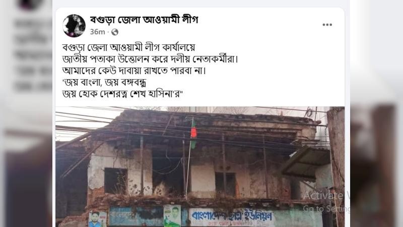 এর আগে, দিনের কোনো এক সময় পতাকাটি উত্তোলন করা হয়। পোস্টে লেখা হয়েছে, বগুড়া জেলা আওয়ামী লীগ কার্যালয়ে জাতীয় পতাকা উত্তোলন করেছেন দলীয় নেতাকর্মীরা। আমাদের কেউ দাবায়া রাখতে পারবা না। জয় বাংলা, জয় বঙ্গবন্ধু। জয় হোক দেশরত্ন শেখ হাসিনার। ওই স্ট্যাটাসের মন্তব্যের ঘরে রাসেল শেখ নামে এক ব্যক্তি লিখেছেন, ইনশাল্লাহ একদিন পুনর্বাসন হবে। আজিজার রহমান তাজ নামে আরেক ব্যক্তি লিখেছেন, জয় বাংলা।