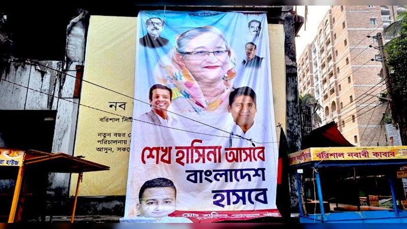 বরিশাল মহানগর ও জেলা আওয়ামী লীগের কার্যালয়ে শেখ হাসিনা আসবে বাংলাদেশ হাসবে স্লোগান সংবলিত ব্যানার টাঙানো হয়েছে।